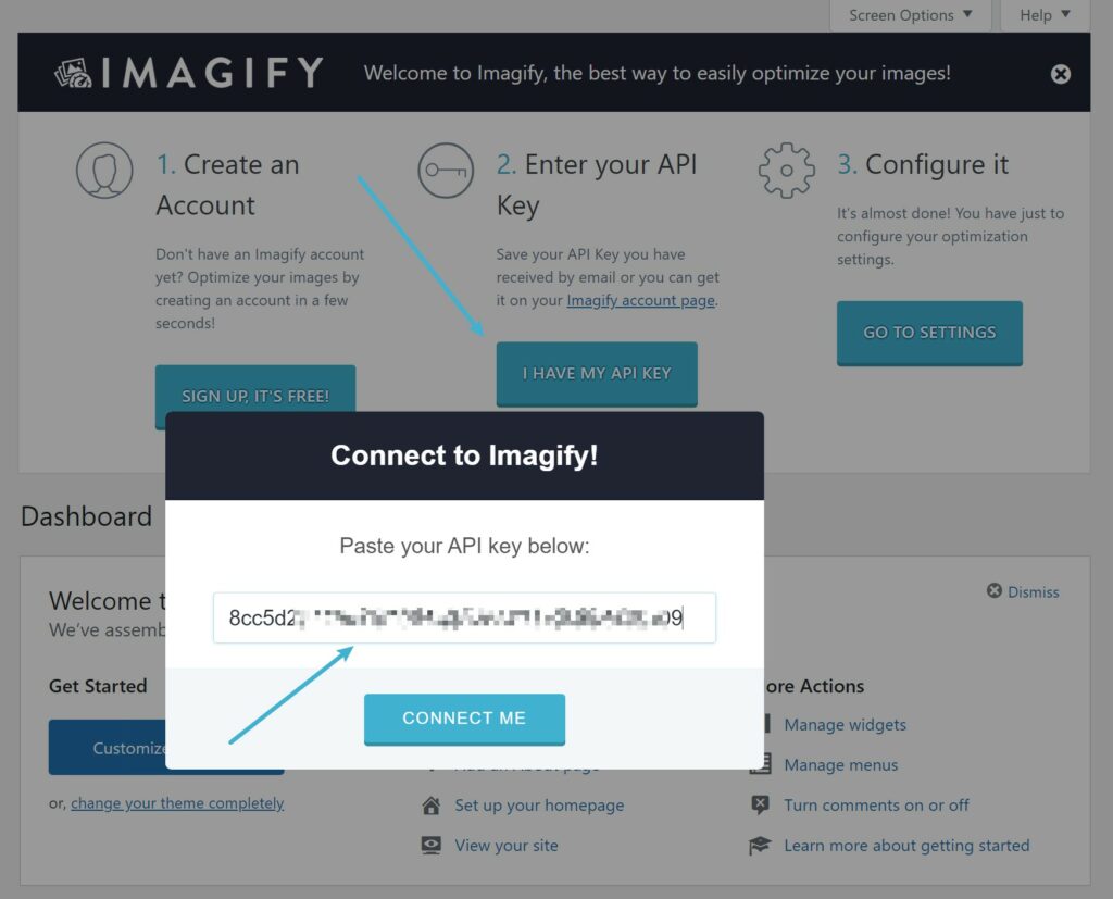 Depois de ativá-lo, você será solicitado a criar uma conta e inserir uma chave de API do Imagify. Obter uma chave de API do Imagify é gratuito - você só precisa se registrar para uma conta aqui.