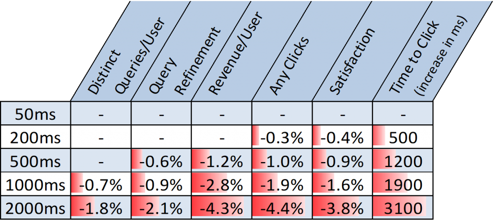 Eric Schumann, do Bing, falou sobre a importância dos atrasos do servidor em seu relatório. Durante o experimento, ele descobriu o que aconteceria se as páginas dos sites fossem carregadas 1,5 segundo a mais do que o normal.