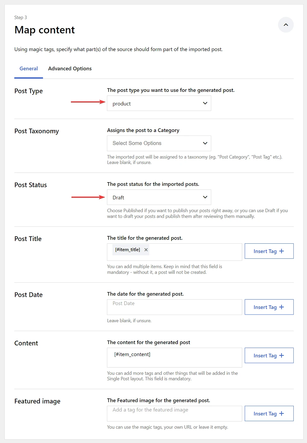 Mapeie o conteúdo corretamente e certifique-se de definir o Tipo de postagem como Produto e o Status da postagem como Rascunho .