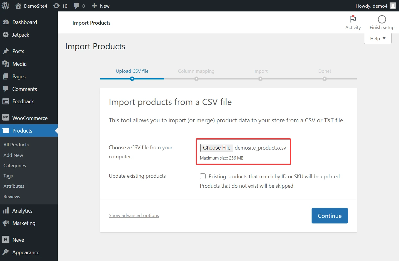 2. Carregue o arquivo CSV usando WooCommerce Import