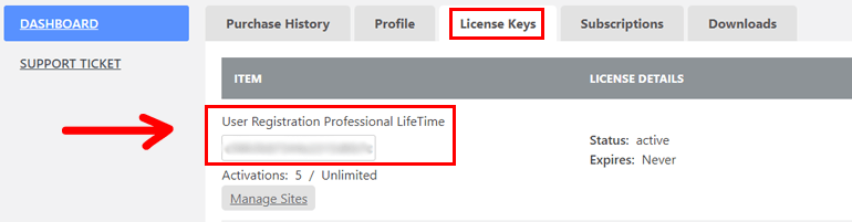 Se você estiver usando a versão premium do Registro de Usuário, deverá ativar sua licença. Você encontrará a chave de licença no painel da sua conta WPEverest na guia Chaves de licença .