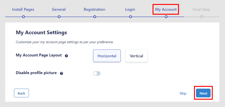 Esta etapa ajuda você a personalizar as configurações da página Minha conta . Portanto, você pode selecionar o layout Horizontal ou Vertical para a página.