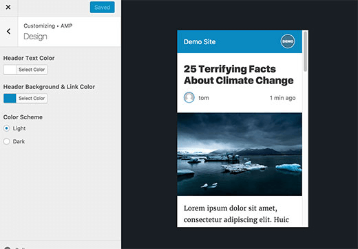 Você pode ver a aparência do seu site em dispositivos móveis ao usar AMP. Dependendo do seu tema, pode mostrar seu logotipo e favicon. Você pode fazer muita personalização para mudar a aparência se não gostar da forma como ela é mostrada. Você pode alterar rapidamente a cor da fonte ou a cor de fundo do cabeçalho. Clique no botão Salvar quando todas as alterações forem feitas.