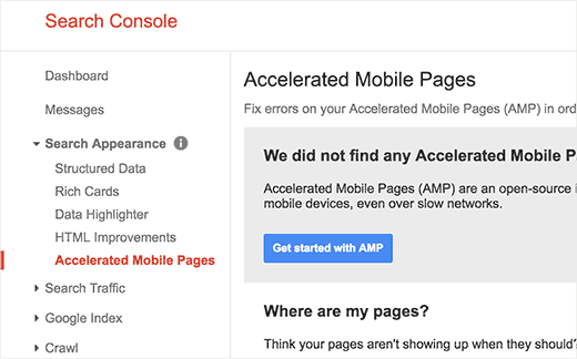 Alguns de vocês podem estar instalando o AMP no WordPress para obter uma boa classificação nas páginas de resultados do mecanismo de pesquisa do Google. Você pode conferir a aparência do seu site na pesquisa do Google usando o Google Search Console (GSC). Supondo que você já tenha adicionado seu site ao GSC, vá para sua conta do GSC e no menu à esquerda, clique em Search Appearance. Abaixo dele, você encontrará Accelerated Mobile Pages. Dentro dele, você verá seu site e páginas da web. É importante observar que seu site pode não aparecer imediatamente após a instalação do plug-in AMP porque o Google pode levar algumas horas a dias para indexar suas páginas da web.