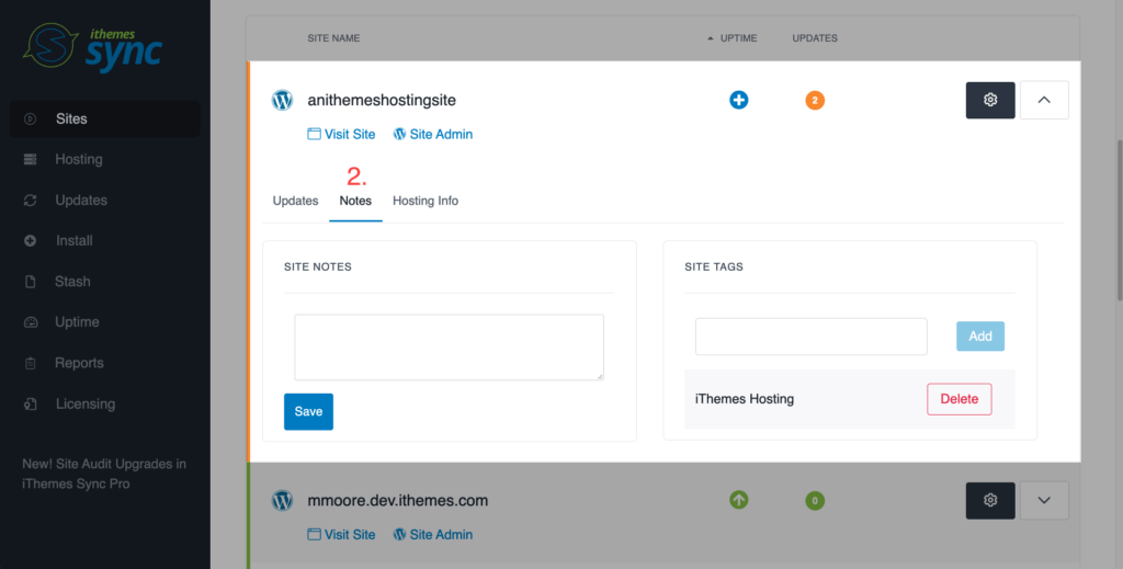 2. Notas - Adicione e visualize tags e notas em seu site. O recurso de anotações do Sync é uma maneira prática de manter anotações sobre seus sites sincronizados. Por exemplo, se você adicionou personalizações a arquivos de tema ou plug-in que podem ser perdidos com uma atualização, adicione um lembrete. Identifique sites de negócios, sites pessoais, sites de clientes, ativos, não ativos ou como quiser, para poder identificar seus sites.