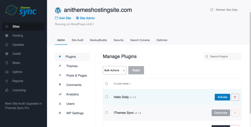 A visualização individual do site do Sync permite que você execute ações administrativas específicas do site, como executar atualizações de plug-ins e temas do WordPress, fazer backups remotos do WordPress e muito mais.