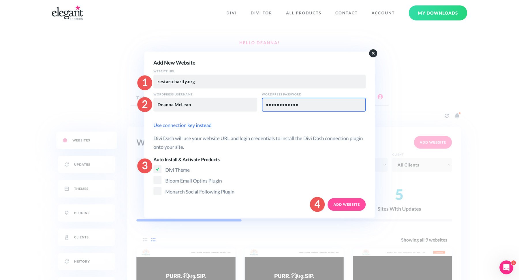 Quando a caixa de diálogo aparecer, insira o nome do site, as credenciais de login do WordPress e selecione os produtos Divi para instalação automática. Por fim, clique no botão Adicionar site para adicionar o site ao painel de gerenciamento do site Divi Dash.
