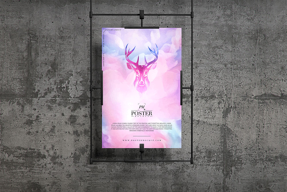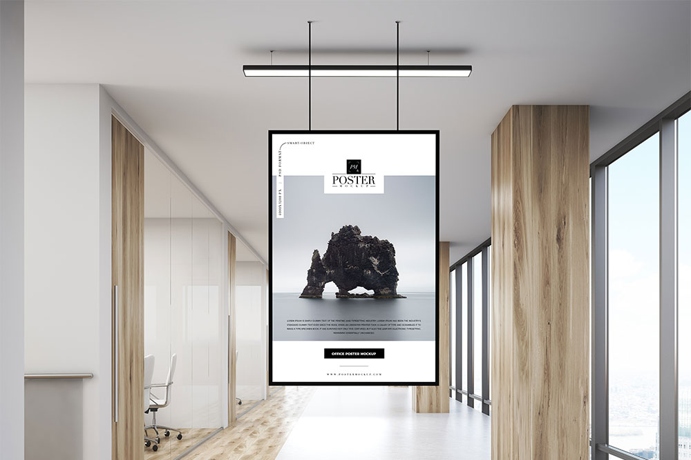 Os pôsteres são aplicáveis a todos os tipos de fins publicitários, seja em ambientes internos ou externos. Se você precisa de uma maquete pendurada no teto, a maquete de pôster de publicidade interna gratuita é uma ótima escolha. Os proprietários de shoppings agora podem ver a mágica acontecer! Apresente-os com um conjunto de designs diferentes, que eles podem escolher posteriormente e melhorar ainda mais, se necessário. A realização de qualquer alteração é feita por meio do Smart Object, tornando as coisas rápidas e diretas para você. Faça com que pareça genuíno e vívido, e faça seu cliente se apaixonar por ele sem pensar duas vezes.