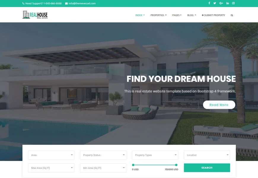 Se você está buscando um ótimo site que resista ao teste do tempo (com mudanças no mecanismo de busca e nos requisitos dos sites), pode confiar na Real House. Este modelo de site imobiliário construído com codificação HTML é perfeito para grandes e pequenas operações imobiliárias. Se você deseja um site responsivo, vai adorar o fato de que o Real House é um modelo de site imobiliário baseado no Bootstrap. Bootstrap é um framework mobile-first que também ajuda a construir sites totalmente responsivos.