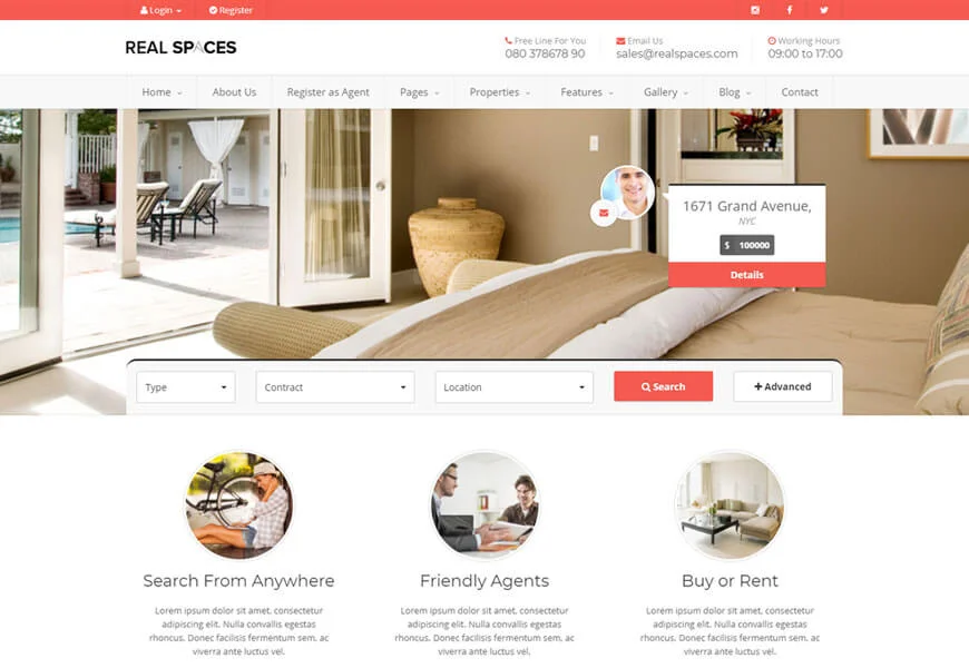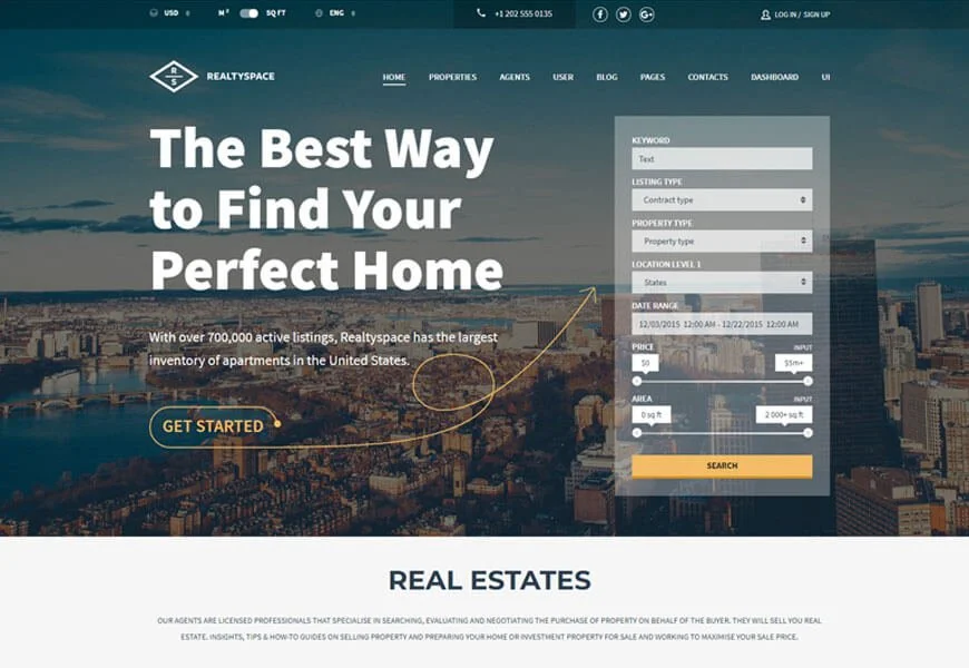 Realtyspace é um dos melhores modelos de sites imobiliários que você pode escolher. Ele passou com sucesso nos testes para provar seus layouts totalmente responsivos. Com a filtragem avançada que vem com esses incríveis modelos de sites imobiliários, seus usuários podem filtrar propriedades em seu site usando uma infinidade de critérios. Como o Realtyspace vem com o Google Maps e a integração do Street View, ele exibirá suas propriedades imobiliárias em mapas precisos para uma experiência de usuário estelar.