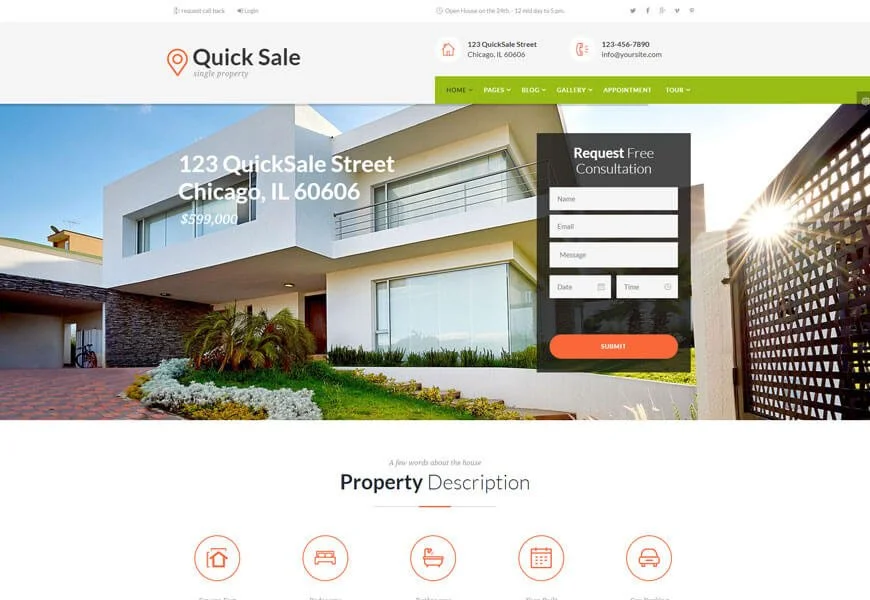 Quick Sale é um modelo de design limpo e elegante que possui uma construção pronta para Retina. Isso permite que os usuários com uma tela de alta resolução em seus dispositivos visualizem o site com a melhor definição possível. Com este modelo de site imobiliário para sites HTML, você recebe 27 estilos de galeria dos quais pode escolher aquele com o qual deseja exibir a galeria contendo suas listagens de propriedades.