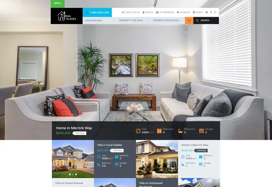 O setor imobiliário tem tudo a ver com propriedades visíveis; portanto, seu site deve fazer com que suas listagens de imóveis pareçam tão reais quanto. O Real Places é um dos melhores modelos de sites para investidores imobiliários que tornam isso possível. Ele oferece vários recursos úteis que permitem criar seu site e usá-lo facilmente, sem a necessidade de conhecimento de codificação. Como este modelo de site imobiliário é baseado em Bootstrap, ele possui um layout responsivo e parecerá tão elegante em telas grandes quanto em telas pequenas.