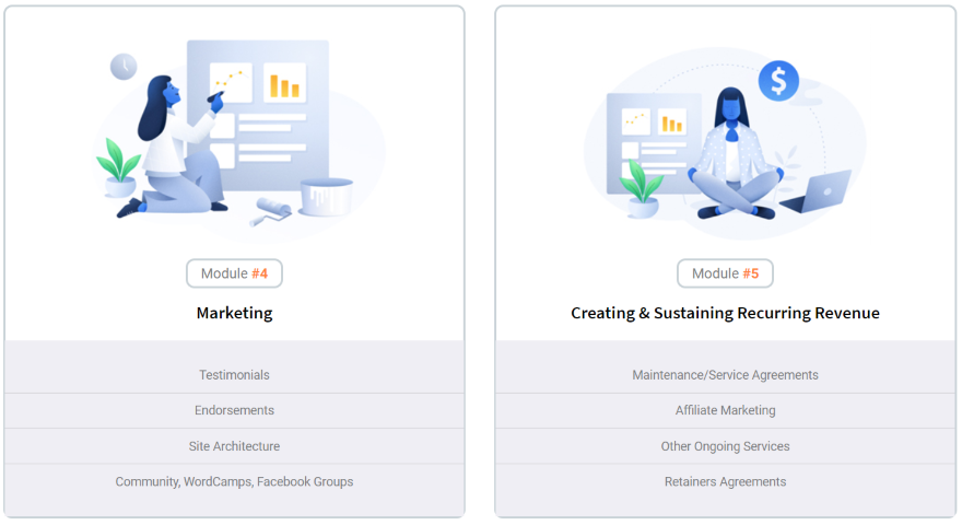 O curso cobre tudo o que você precisa saber sobre como iniciar, administrar e expandir seus negócios. Inclui hospedagem, por que usar o Divi, construção de seu portfólio, obtenção de clientes, gerenciamento de projetos, sustentação de seu negócio, crescimento de sua comunidade e muito mais. Também inclui informações sobre como evitar que os negócios caiam entre os projetos e como preencher as lacunas com outros tipos de trabalho para sustentar os negócios.