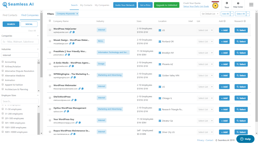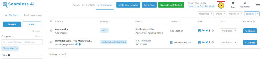No exemplo acima, selecionei Internet como o setor e adicionei a palavra-chave WordPress. Deixei todos os outros critérios em branco. Mostra o nome da empresa, setor, tamanho, localização e algumas opções. Clique em Adicionar para adicioná-los à sua lista. Isso revela seus links sociais para seguir e permite que você selecione uma lista para adicioná-los. Clique em Selecionar para adicioná-los ao campo Empresas na pesquisa.