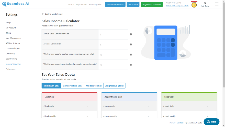É importante definir metas em qualquer negócio para ajudá-lo a permanecer no alvo. A Seamless AI tem ferramentas que facilitam a definição e o rastreamento de seus objetivos. Insira os dados sobre suas metas de vendas e comissões na Calculadora de Renda de Vendas.