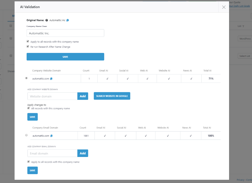 Clicar no endereço de e-mail abre um modal com muitas informações da empresa, como números de telefone, endereços de e-mail, etc. Ele tem recursos de aprendizado de máquina que recebem feedback de você e os aplicam de volta ao banco de dados para melhorar sua precisão. Por exemplo, se você enviar um e-mail ou ligar para um número de telefone, poderá clicar no botão polegar para baixo se a informação não estiver correta e no botão polegar para cima se estiver correta. Também permite que você forneça mais informações, se desejar.