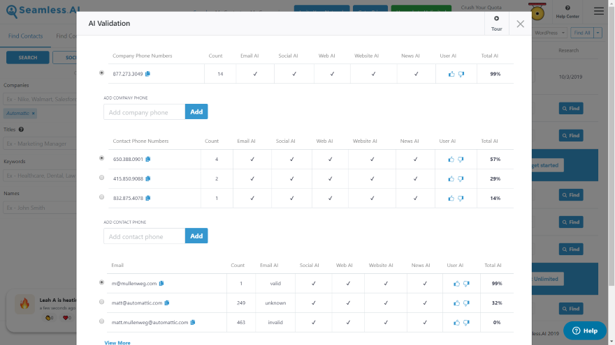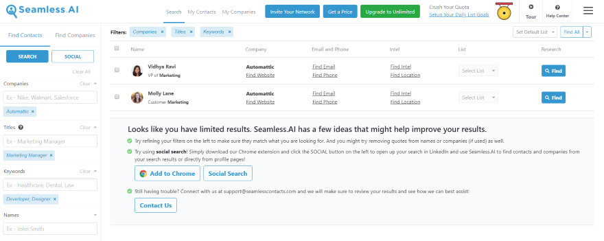 O Seamless AI é um grande banco de dados com cerca de 800 milhões de contatos. Inclui muitas informações profissionais (não privadas) que são relevantes para o crescimento do seu negócio. As contas são direcionadas e relevantes. Eles são identificados como os contatos mais lucrativos com base em suas personas e sucessos anteriores.