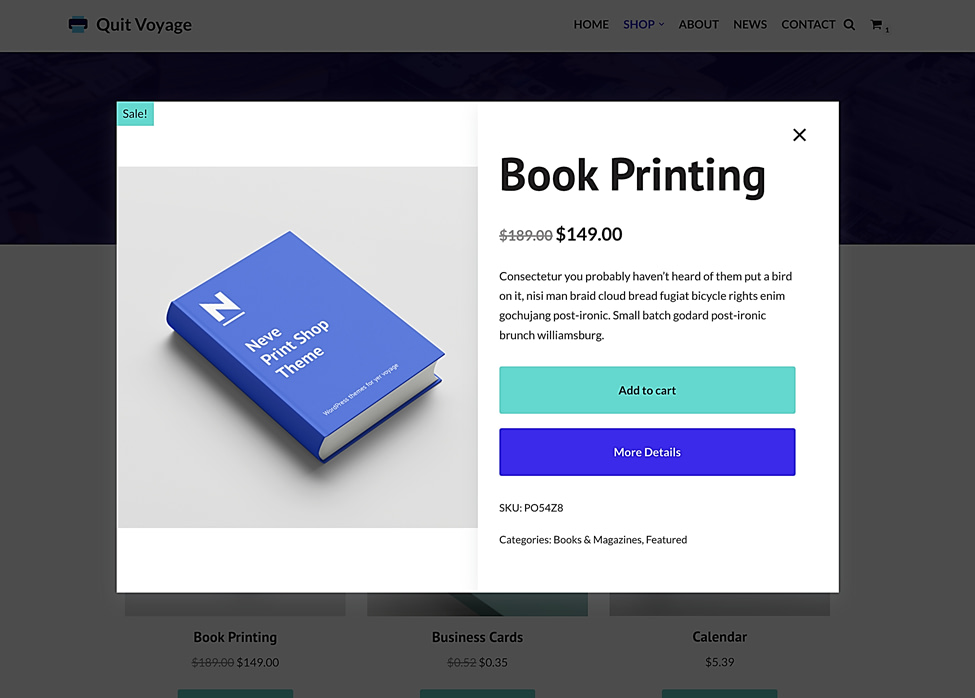 Nas páginas de listagem de lojas, o recurso Quick View aparece como um único botão em cada produto. É nele que os clientes clicam para abrir uma janela pop-up com informações detalhadas sobre o produto. Você pode criar o seu para incluir especificamente imagens, descrições de produtos, preços e botões de adicionar ao carrinho.