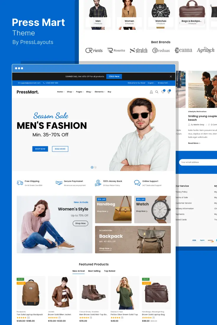 O PressMart é um tema WordPress Elementor WooCommerce moderno e exclusivo, perfeito para qualquer loja online, seja uma loja de moda, de eletrônicos ou de móveis.