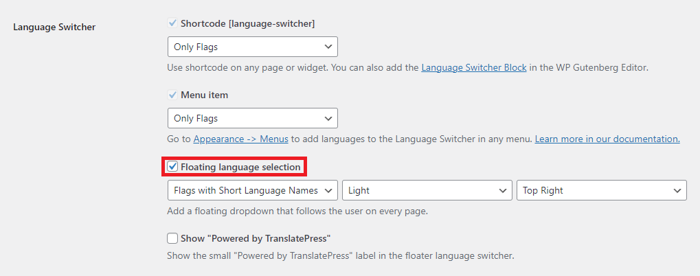 - Seleção de idioma flutuante: Vá para Configurações do TranslatePress → Geral → Alternador de idioma e marque a caixa para Seleção de idioma flutuante.