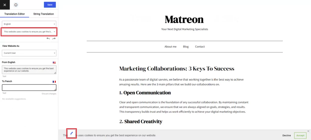 Para traduzir seu banner de consentimento, comece selecionando o conteúdo do banner GDPR no menu suspenso na barra lateral esquerda ou clicando no ícone de lápis próximo ao banner na visualização do site. Isso abrirá o texto original junto com as caixas de tradução na barra lateral esquerda. Insira o texto traduzido nas caixas dedicadas e clique em Salvar .