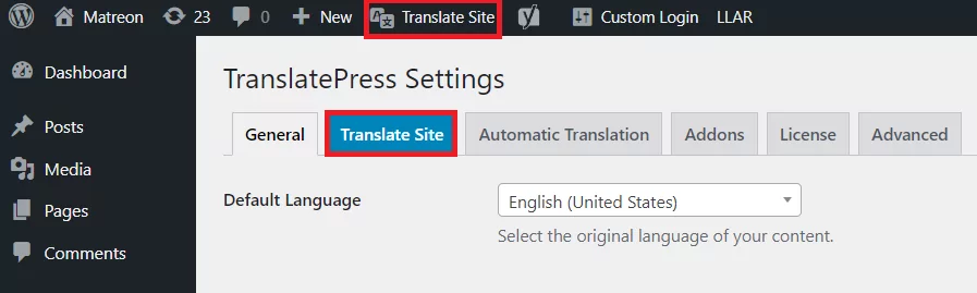 Nas configurações do plugin, você terá duas opções para começar a traduzir cookies: clicar em Traduzir Site nas configurações ou usar a opção Traduzir Site na barra de administração do WordPress.