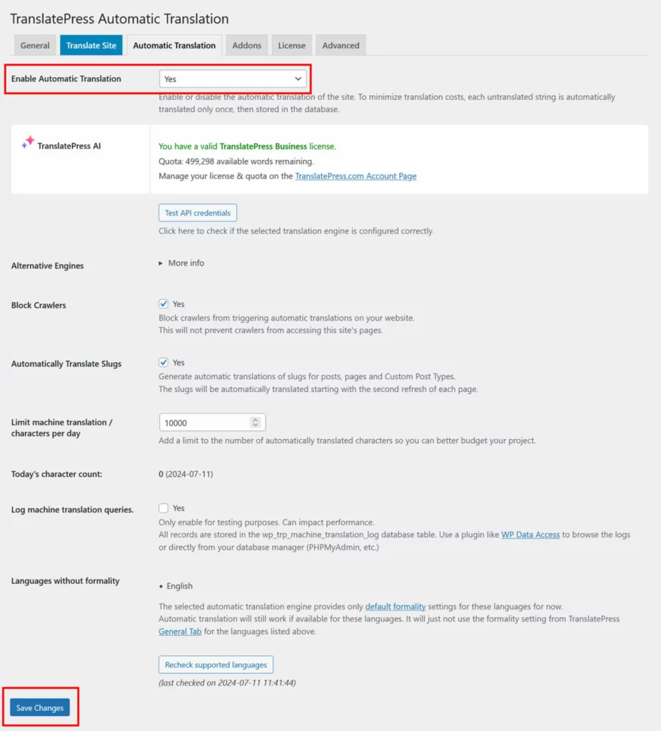 Para usar o TranslatePress AI, nas configurações do TranslatePress, vá para a guia Tradução Automática . Aqui, mude o menu suspenso em Habilitar tradução automática para Sim e clique em Salvar na parte inferior.