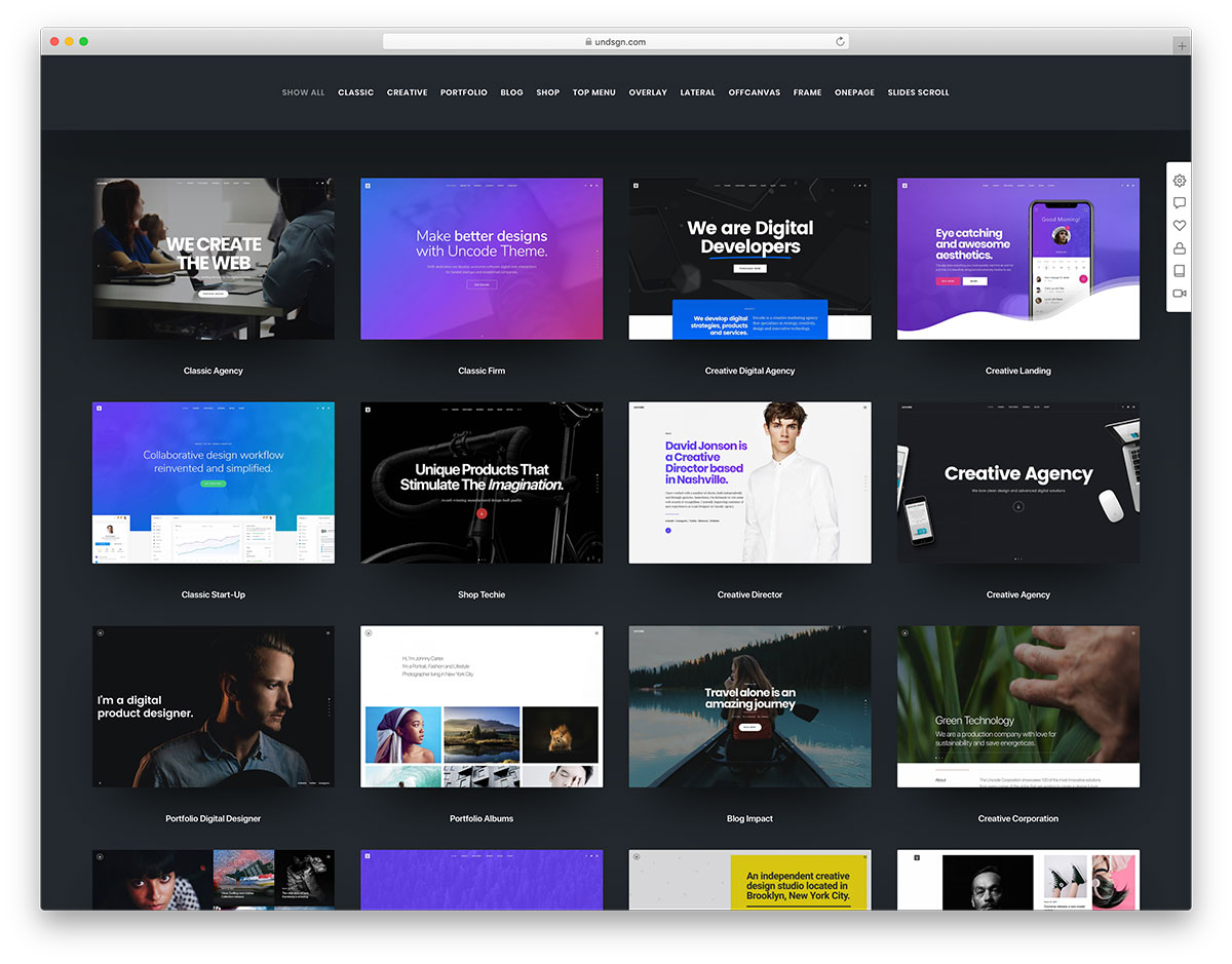 Assim como os modelos de página mencionados acima, o tema Uncode tem muitas opções para ajudar os criativos a colocar seus portfólios online. Na verdade, é justo dizer que o Uncode tem uma vasta seleção de modelos de portfólio para os criativos escolherem.