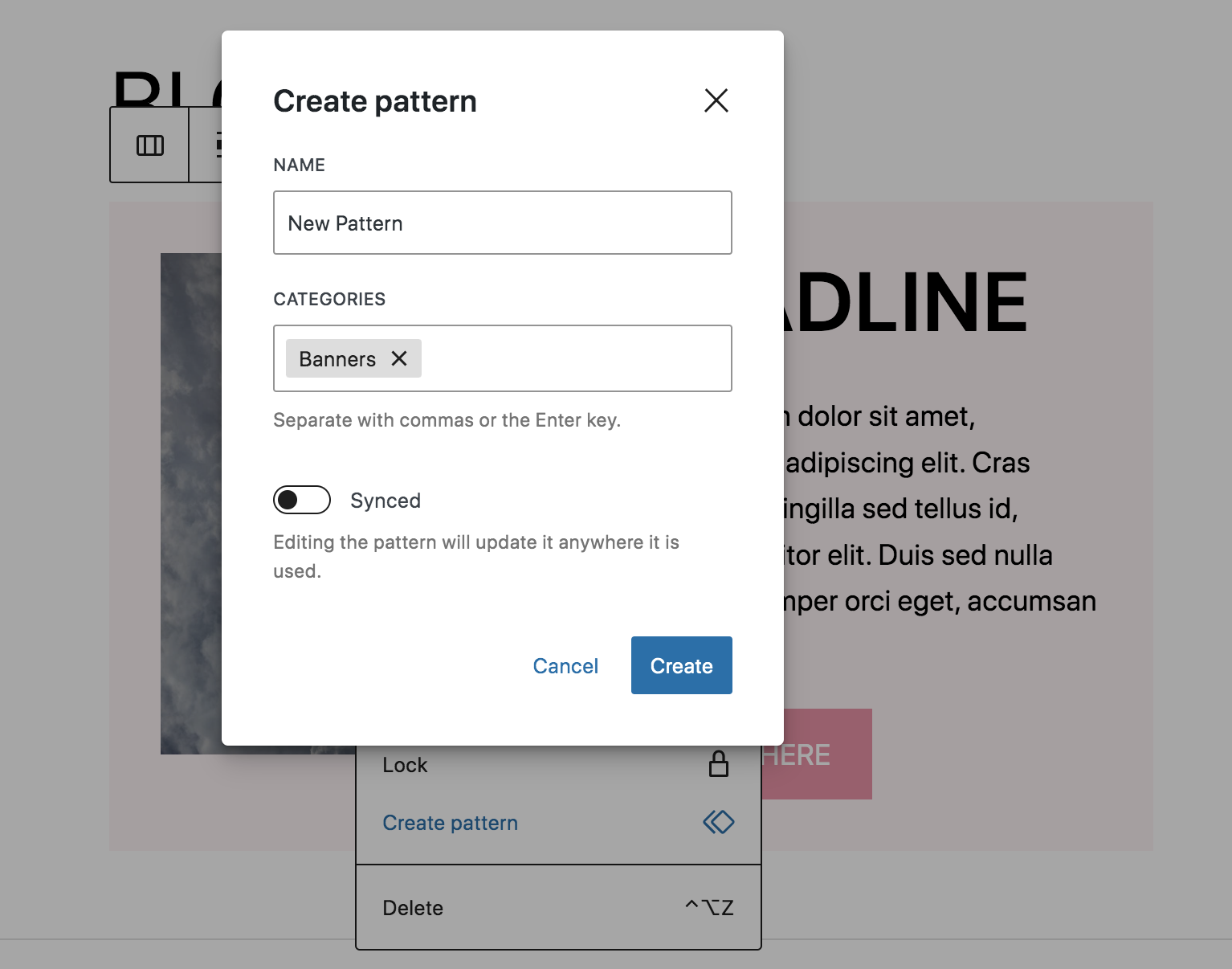 Uma caixa aparecerá com opções para o padrão. Preencha o nome e a categoria e escolha se deseja sincronizar em seu site ou não. Se estiver sincronizado, quando você fizer alterações em um local, elas serão atualizadas em todos os lugares onde for usado. Clique no botão azul Criar .
