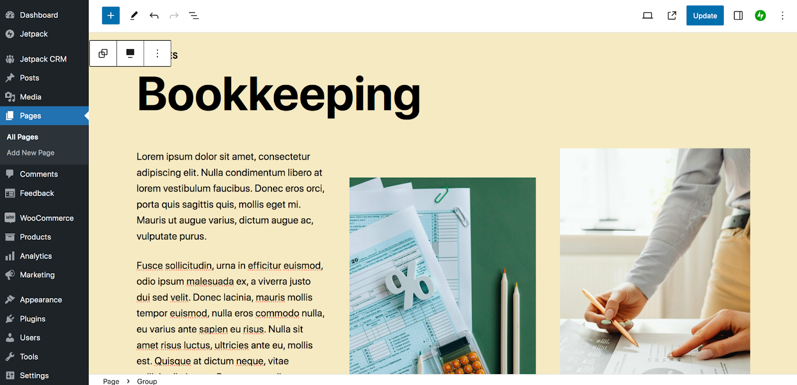 Agora, você deseja substituir o conteúdo pelo seu próprio e remover todos os blocos que não deseja usar. Você pode fazer isso da mesma forma que faria ao trabalhar com o editor de blocos em outras circunstâncias. Se precisar de um lembrete rápido, confira nosso guia do editor de blocos do WordPress.