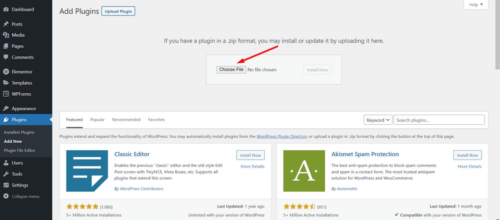 Para instalar o plug-in, vá para o painel de administração do WordPress e, em seguida, vá para a seção Plugins> Adicionar novo .