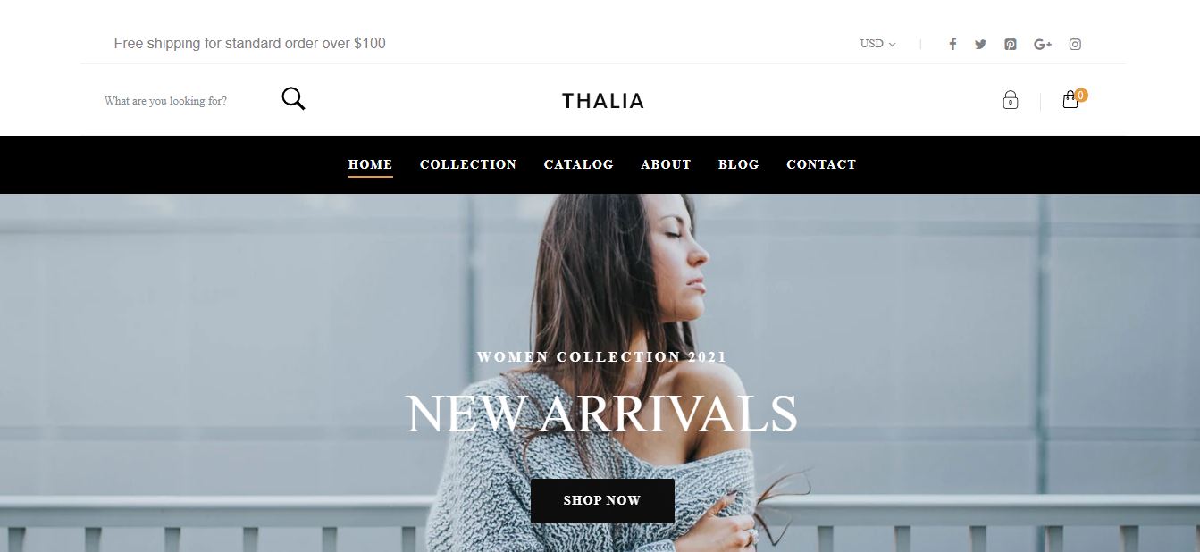 Thalia este printre cele mai bune teme gratuite de comerț electronic Shopify pe care ar trebui să le încercați. Vine cu un design curat și minimalist, potrivit pentru crearea unui magazin de modă sau îmbrăcăminte. Cu toate acestea, poate funcționa bine și în alte proiecte de comerț electronic. Această temă oferă mostre avansate pentru detaliile produsului dvs. În plus, Thalia include funcții precum căruciorul Ajax, prezentarea de diapozitive receptive și filtrele avansate. Puteți schimba culoarea, tipografia, logo-ul și alte setări pentru a se potrivi și cu marca dvs. Merita considerat? Încearcă Thalia astăzi!