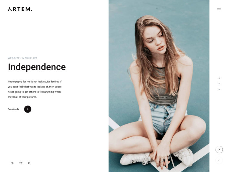Demo-ul site-ului Artem vine în versiuni deschise și întunecate și, datorită acestui lucru, puteți aplica rapid stilul care se potrivește cel mai bine pentru agenția dvs. de creație. Deoarece site-ul web pre-construit care vine cu această temă utilizează un aspect cu ecran divizat, site-ul dvs. va avea cu siguranță un format unic și interesant.