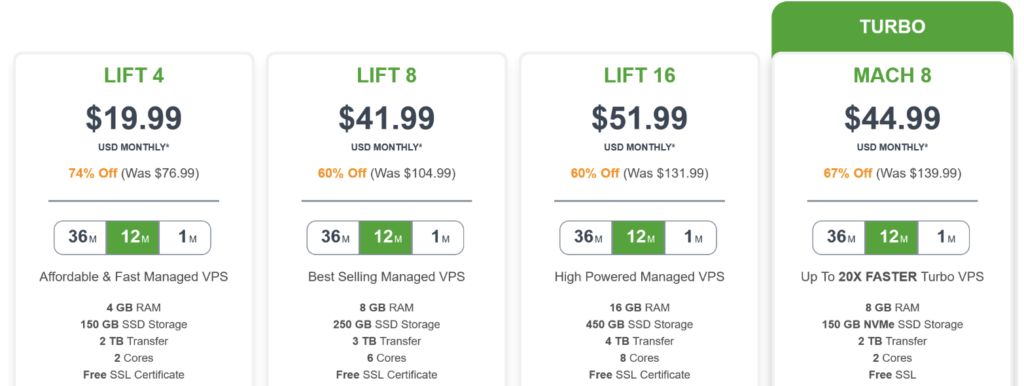 Lift 4 este cea mai ieftină opțiune, incluzând SSL gratuit, o limită de Inode de 2.016.000 și două nuclee pentru 19,99 USD pe lună timp de un an . Fiecare plan oferă secvenţial mai multă RAM, procesor şi spaţiu de stocare pe măsură ce preţul creşte.