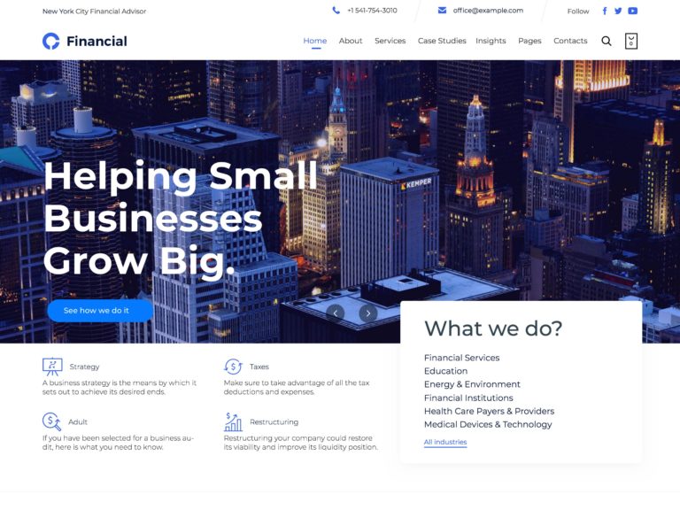 De la consilieri financiari și consultanți la firme de contabilitate și investiții, temele financiare WordPress abordate aici sunt mai mult decât capabile să vă ajute să construiți un site web profesional. Multe dintre aceste teme includ mai multe aspecte de pagină de pornire și demonstrații de site-uri web care vă pot ajuta să vă conectați site-ul cât mai repede posibil.