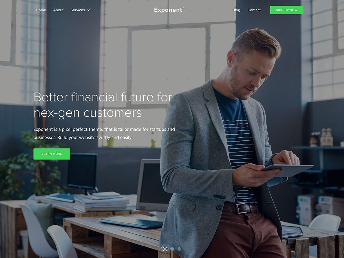 Cu un puternic generator de pagini integrat chiar în inima temei Exponent, puteți deschide oricare dintre paginile și șabloanele pre-construite și puteți începe să le editați printr-o interfață intuitivă de generare a paginilor cu drag-and-drop. De asemenea, puteți personaliza alte aspecte ale site-ului dvs. de servicii financiare prin panoul de control al opțiunilor temei, inclusiv prin utilizarea ColorHub pentru a schimba rapid culorile utilizate pe site-ul dvs. în doar câteva clicuri. Adăugarea de degrade pe site-ul dvs. este, de asemenea, simplă, oferindu-vă o altă modalitate de a vă face site-ul să iasă în evidență din mulțime.