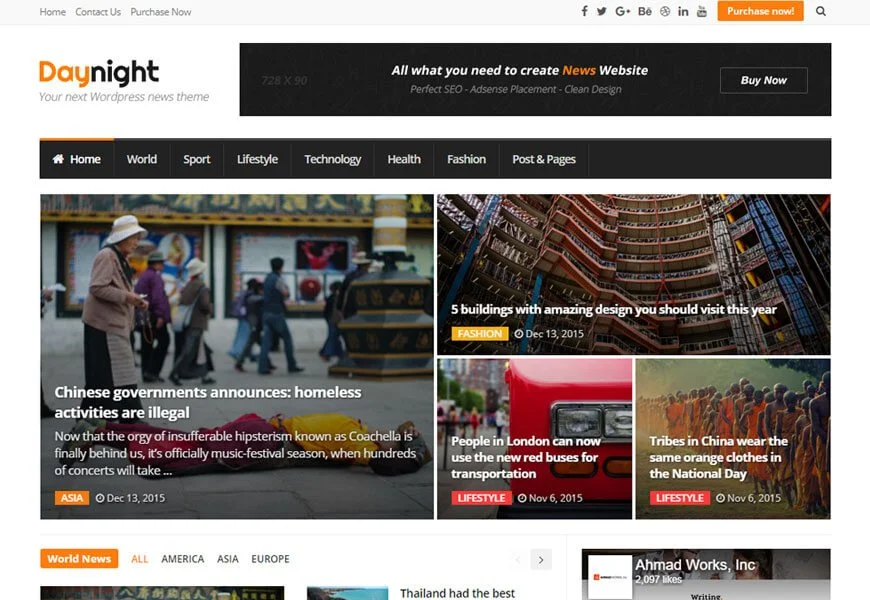 Daynight are opțiunea pentru bare laterale lipicioase personalizate pentru postările și paginile dvs. și puteți seta diferite bare laterale pentru diferite tipuri de postări. Tema are, de asemenea, un meniu principal lipicios pentru o interfață incredibilă, care face ca marca dvs. să pară dominantă. Daynight oferă un meniu contemporan preproiectat pentru utilizatorii dvs. de telefonie mobilă.