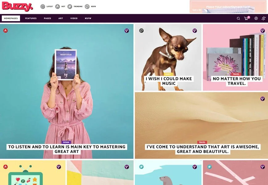 Această temă WordPress premium pentru revistă vă economisește bani, oferindu-vă două plugin-uri premium fără costuri suplimentare. Primești WPBakery Page Builder și Slider Revolution, care costă 46 USD, respectiv 26 USD. Buzzy are combinații puternice de aspect al postărilor, care au ca rezultat cele mai unice pagini. Această temă WordPress pentru site-urile web de reviste are opțiuni pentru a marca postările dvs. ca fiind în tendințe, prezentate și „Ferbinte” pentru a atrage mai mult trafic.