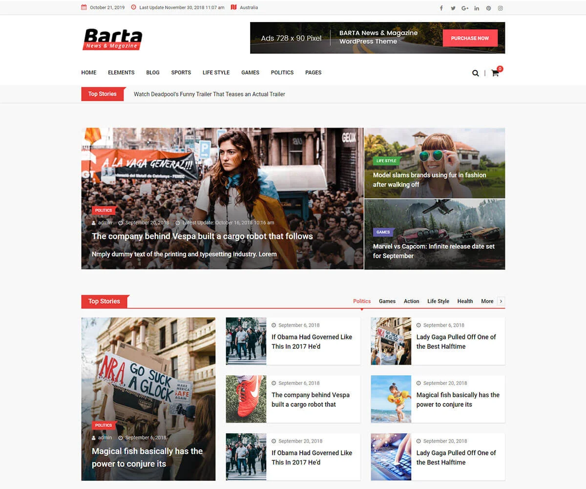Barta vine cu caracteristici unice pentru site-urile web de reviste, cum ar fi o casetă de știri. Această caracteristică folosește aspecte în casete și mai multe variante pentru a prezenta cele mai recente postări. Grila de postări de știri folosește un stil de grilă pentru a vă evidenția conținutul, inclusiv videoclipurile, cu opt variante de aspect. Fila de știri găzduiește până la 4 categorii într-o secțiune elegantă cu file. Aspectul listei de știri folosește un aspect al listei pentru a afișa conținutul de știri. În cele din urmă, glisorul de știri atrage cea mai mare atenție prin utilizarea unei secțiuni de glisare pentru a afișa elementele în tendințe pe pagina ta de pornire.