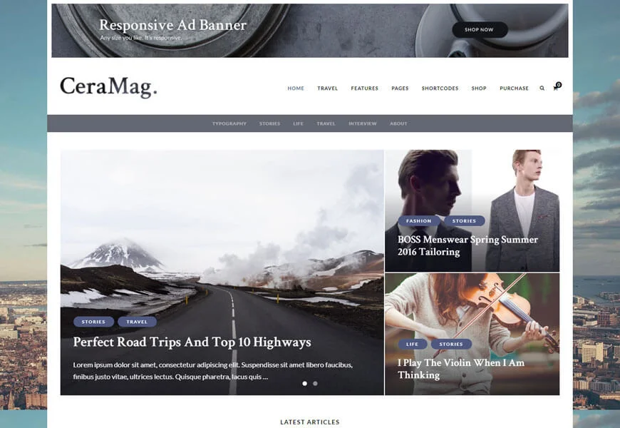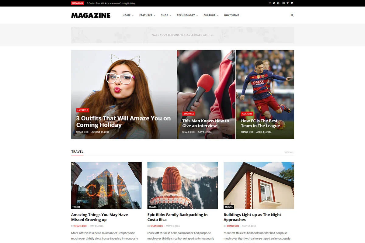 CeraMag este o temă WordPress de revistă creată ingenios, care vine cu un aspect incredibil de curat și contemporan. Puteți importa oricare dintre cele 12 demo-uri prefabricate cu elementele lor, doar pentru a le modifica după preferințele dvs. mai târziu. În ciuda faptului că CeraMag are mai mult de 120 de opțiuni de personalizare, nu se simte plin de funcții. Cele 2 poziții prestabilite pentru butoanele de distribuire socială sunt perfecte pentru partajarea conținutului cu Instagram și Facebook. Puteți adăuga retweeturile și distribuirea conținutului dvs. cu butonul „Tweet It”.