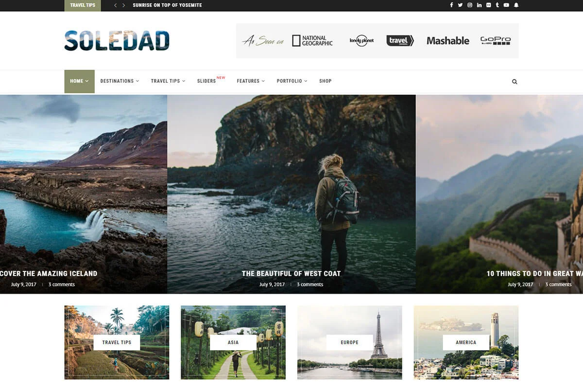 Aspectul tău nu va deveni niciodată monoton cu cele peste 1000 de combinații de slider și blog. Oferă mai multe spații pentru plasarea anunțurilor și acceptă includerea de anunțuri în postări. Soledad are o varietate de modele de galerie, inclusiv grilă și zidărie, care găzduiesc un număr diferit de coloane. Puteți utiliza derularea infinită și puteți încărca mai multe opțiuni pentru o navigare fără întreruperi în postări. Are un meniu din bara de sus și mai multe stiluri pentru bara laterală. Pentru corp, puteți alege să mergeți cu oricare dintre cele patru stiluri. Stilul cu lățime completă are un aspect robust. Lățimea cutiei vine cu trei variante; imagine de fundal, orice culoare și imagine model.