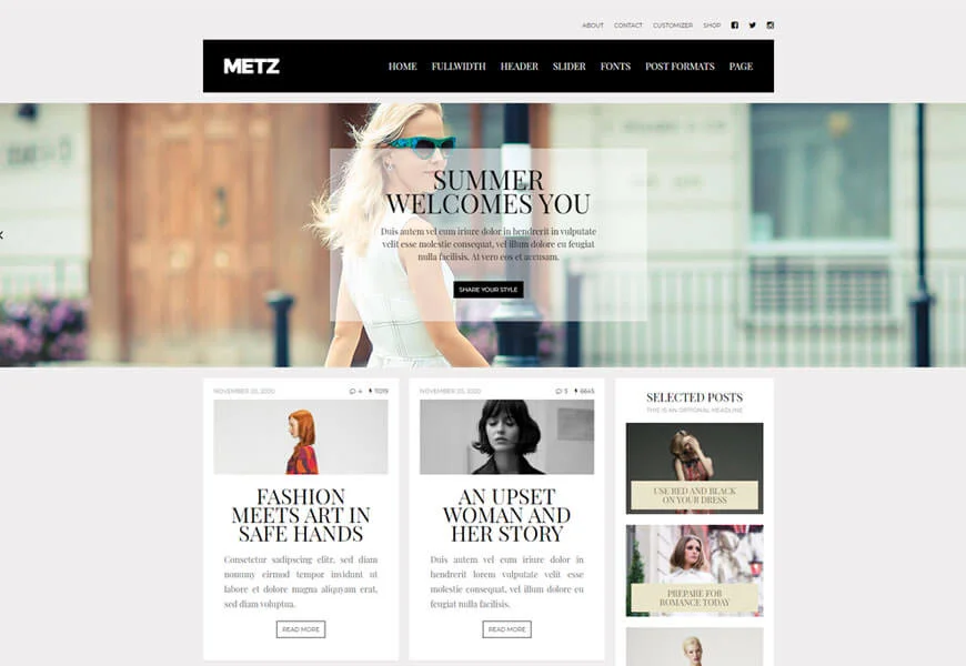 Această temă WordPress premium pentru revistă vă permite să aveți opțiuni speciale pentru bara laterală pentru diferite formate. Metz oferă o bară laterală fixă, astfel încât să puteți face un anumit widget sau întreaga bară laterală lipicioasă cu Q2Q3 Fixed Widget. Puteți combina mai multe stiluri de înregistrare pentru vizualizări unice și indexate. Personalizatorul este bine organizat pentru a vă permite să manipulați cu ușurință setările site-ului. Puteți ascunde și afișa cu ușurință aproape toate elementele pe care le aveți pe site-ul dvs.