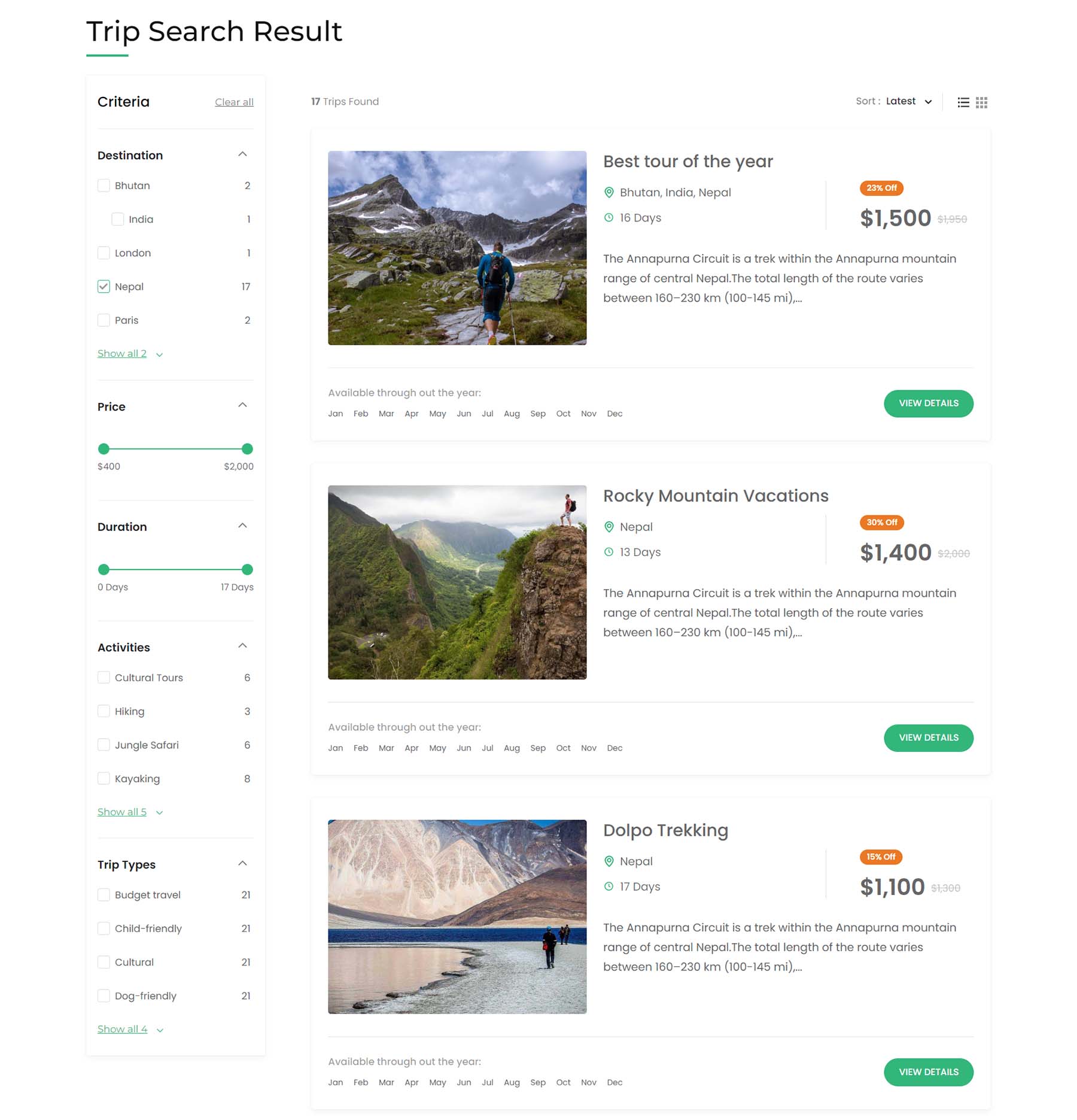 Pagina cu rezultatele căutării este o funcție puternică pe care clienții tăi o vor adora. În primul rând, puteți personaliza filtrele furnizate în funcție de câmpurile personalizate pe care le creați. În continuare, puteți schimba cu ușurință tipografia și branding-ul de pe această pagină. În al treilea rând, puteți vedea anumite excursii, locații și disponibilitatea duratei. De asemenea, puteți vedea dacă există vânzări disponibile chiar în rezultatul căutării.