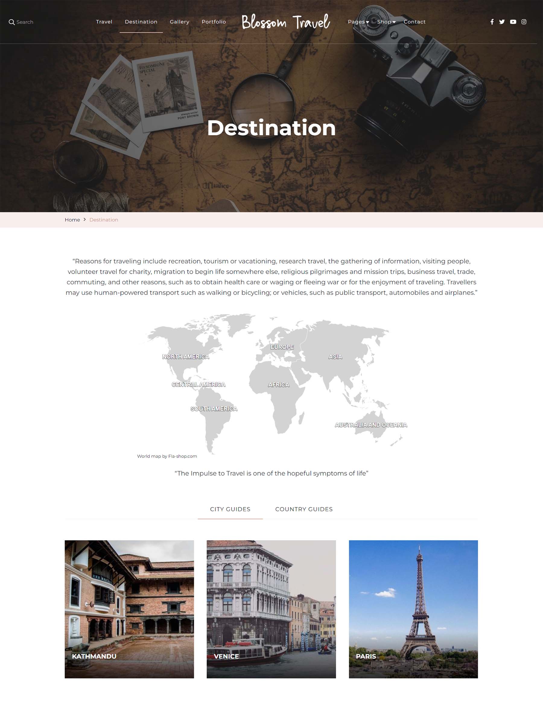 Funcția de ghidare a orașului din Blossom Travel Pro vă permite să grupați tot conținutul despre fiecare destinație pe care ați vizitat-o pe o singură pagină. Pagina prezintă o hartă interactivă HTML5 cu un sfat explicativ al locurilor interesante pe care le-ați vizitat. Puteți folosi fiecare destinație pentru a afișa o galerie, o categorie de postări, o pagină sau orice doriți să împărtășiți cititorilor dvs.
