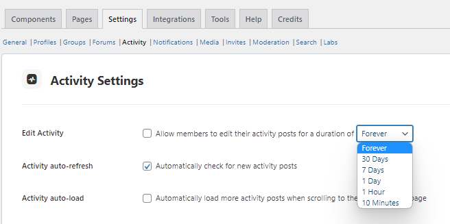 Pentru site-urile de rețele sociale BuddyPress, puteți utiliza pluginul BuddyPress Edit Activity. Pluginul BuddyPress Editare activitate le permite membrilor BuddyPress să își editeze postările de activitate și răspunsurile pe partea frontală a site-ului. Administratorul site-ului poate seta o limită de timp pentru cât timp postările de activitate ar trebui să rămână editabile.