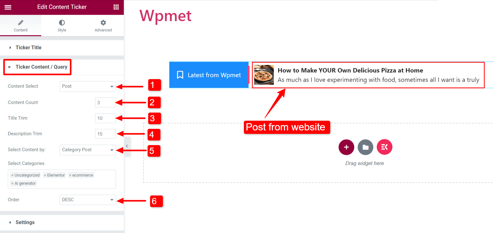 Pasul 2. Personalizați setările de ticker de conținut în Elementor