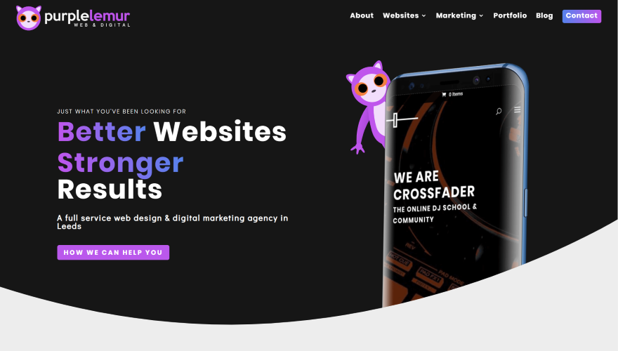 Acest site a fost trimis de Liam Pedley. Titlul, sloganul, CTA și un exemplu de imagine de produs cu o grafică de marcă a unui lemur se află pe un fundal negru care include un divizor de secțiune rotunjit. Textul și butoanele au un gradient violet care se potrivește cu grafica de pe întreg site-ul. Un rând cu trei elemente grafice de lemuri este plasat deasupra unei secțiuni care arată text și blurbs. Dacă faceți clic pe lemuri, veți vedea diferite secțiuni de informații cu o săgeată care indică secțiunea. Informațiile despre companie sunt afișate într-o secțiune cu două coloane, cu un ecran al computerului pe o parte, care arată o imagine de fundal în paralela reală. Îmi place în special secțiunea de portofoliu. Afișează imagini sub un unghi. Trecând peste oricare dintre ele ridică imaginea în sus și spre ecran, lăsând diapozitive colorate în spatele lor. Un glisor de mărturie arată trei laturi la un moment dat, cu una în centru plat și celelalte două înclinate. Include, de asemenea, carduri de blog stilizate și blurbs cu animații în cursă pentru fiecare dintre servicii.