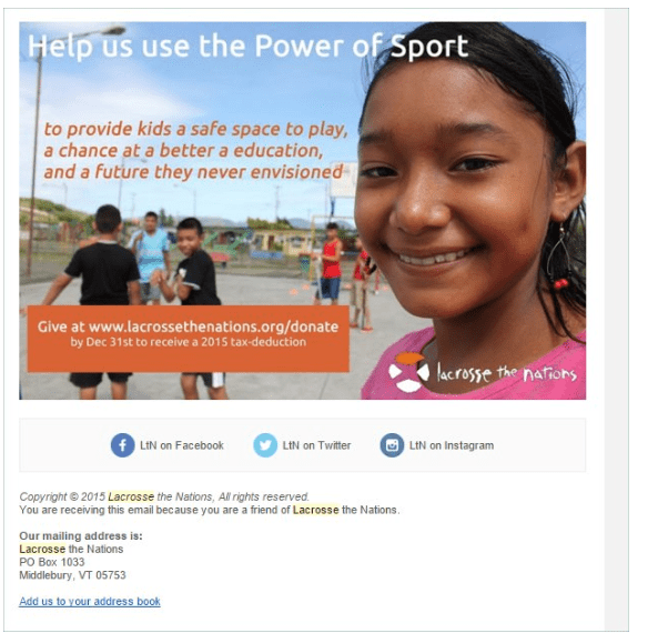La fel ca site-ul dvs., un buletin informativ nonprofit prin e-mail trebuie să afișeze un buton de donare evident și pictograme de rețele sociale în el. Iată un exemplu de unul dintre buletinele informative nonprofit.