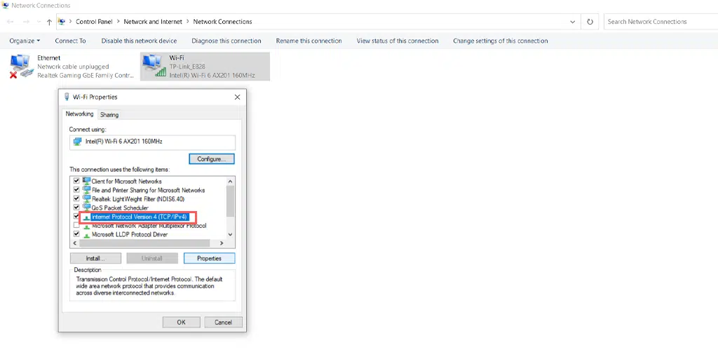 5. În fereastra Proprietăți, alegeți „Internet Protocol Version 4 (TCP/IPv4)”.
