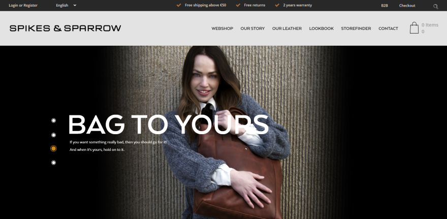 Spikes and Sparrow prezintă un glisor cu lățime completă pentru a prezenta produsele. Glisorul are un stil de navigare în partea stângă. Următoarea secțiune prezintă categoriile într-un aspect cu mai multe coloane utilizând imagini cu suprapuneri de text stilizate. Paginile magazinului arată produsele cu o bară laterală WooCommerce. Paginile produselor arată elegant, cu culorile lor de marcă. Nu prezintă multe informații, dar includ produsul în alte culori.